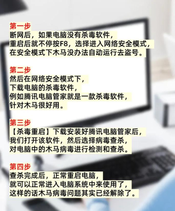 电脑中毒后应立即断开网络,避免信息泄露。备份重要文件,使用杀毒软件或安全模式查杀病毒,必要时重装系统。避免重启,防止病毒进一步破坏。