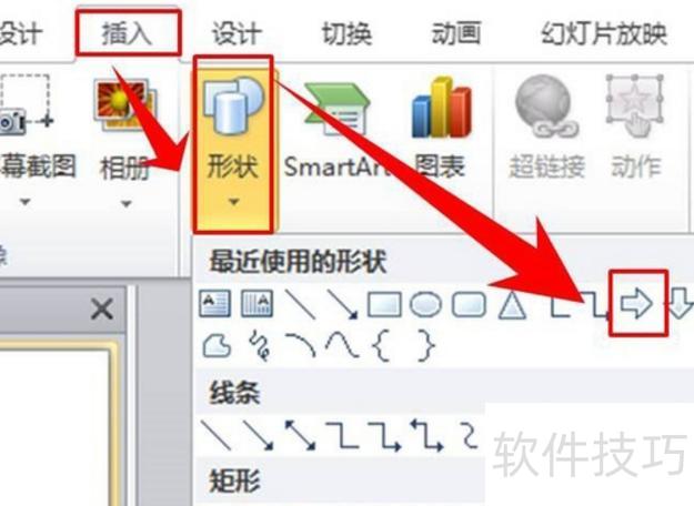 新建一个PPT文件,点击菜单栏中的,选择,在形状列表中挑选一个基础箭头符号插入幻灯片中。