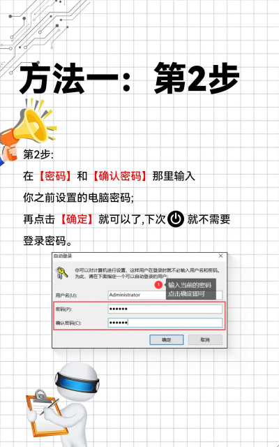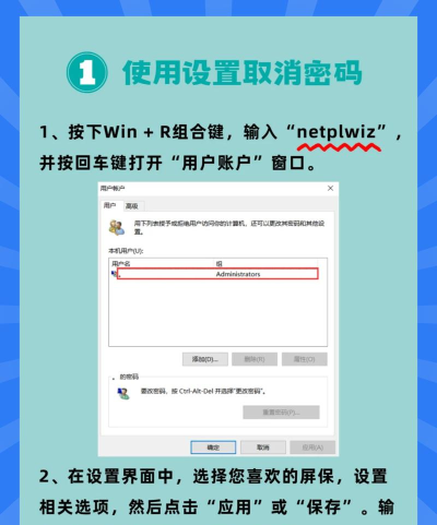 第一步: 同时按键盘上是“window键”(一般是键盘最下面一排第二个)和“R键“,并在弹出的窗口输入“netplwiz”然后确定。 取消电脑开机密码 第二步: 然后会弹出的“用户账户”窗口,接下来 取消勾选 “要使用本计算机,用户必须输入用户名和密码” 取消电脑开机密码 第三步: 上面点击确定后,会弹出自动登录设置窗口,然后在密码框和确认密码框, 输入密码后确定 。 就大功告成了。