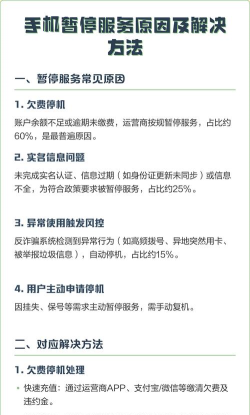 手机暂停服务可能由欠费停机、挂失停机、涉诈风险停机或系统升级停机引起,具体原因需结合运营商政策及用户行为判断。