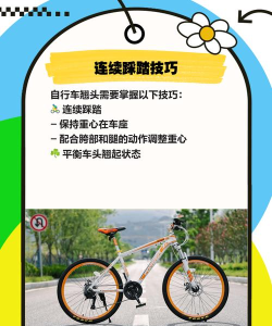自行车翘头需在平坦场地练习,调整姿势,加速后重心后移,右脚踩踏板同时左脚深踩,双臂水平向上端车把,保持平衡。注意安全,避免摔倒。