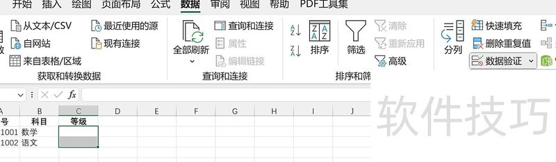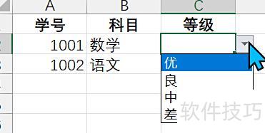 第一步:打开目标Excel文件,选中需设置下拉菜单的单元格区域,如示例中所示,选择C2至C3单元格用于设置等级选项。