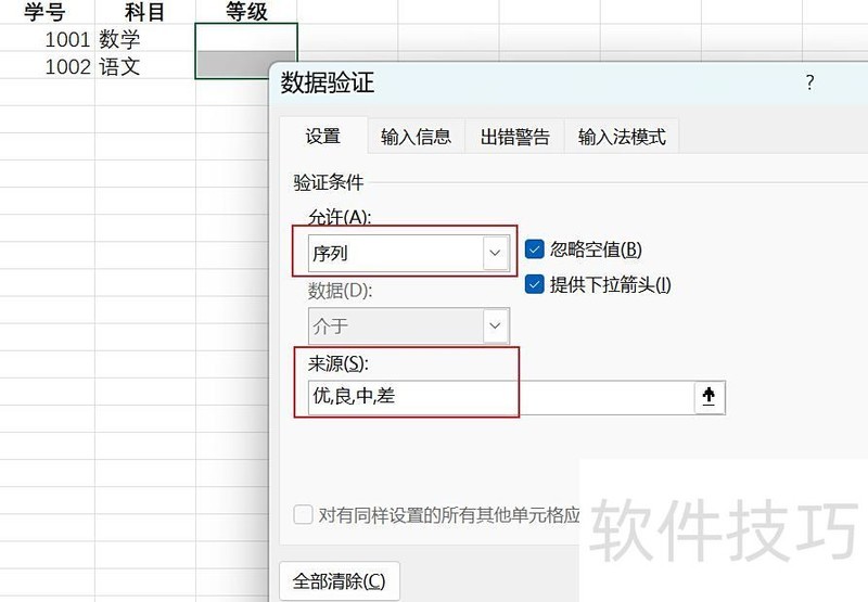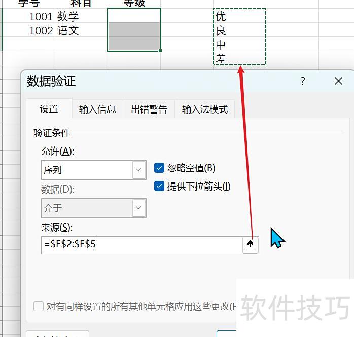 所示,来源栏输入优、良、中、差四个字。