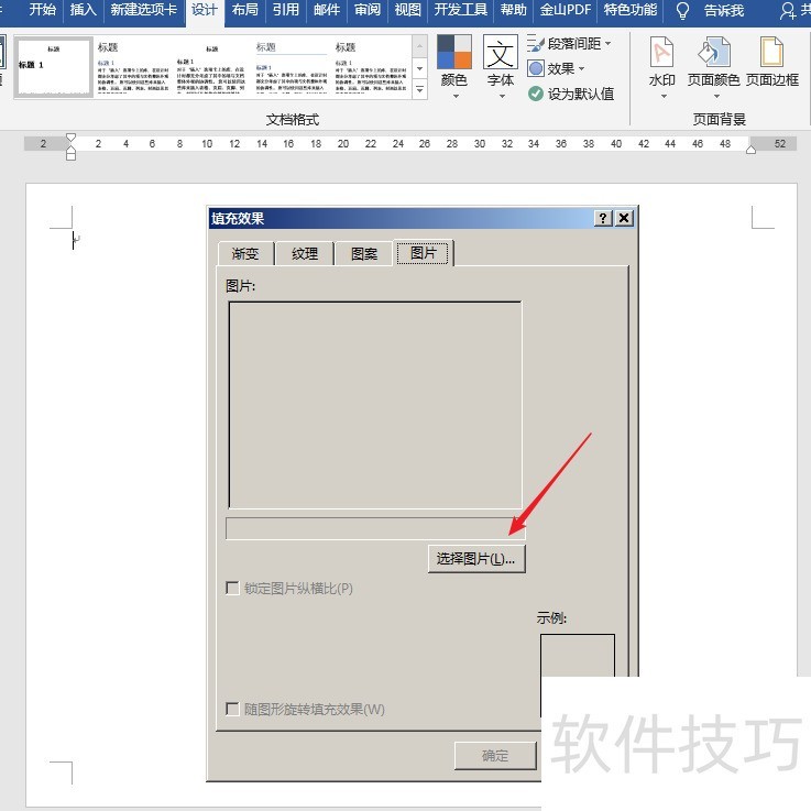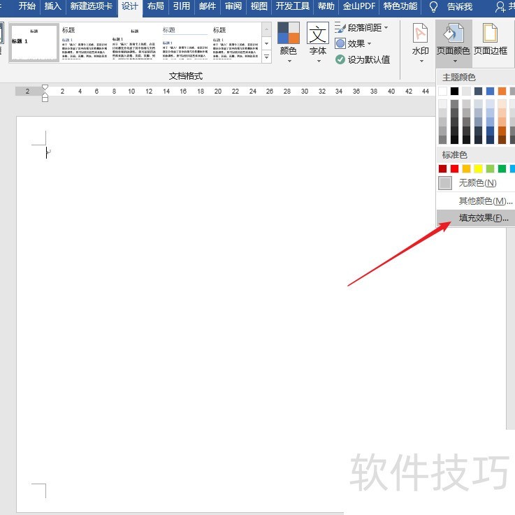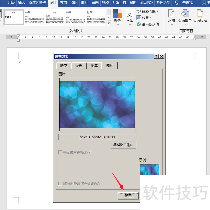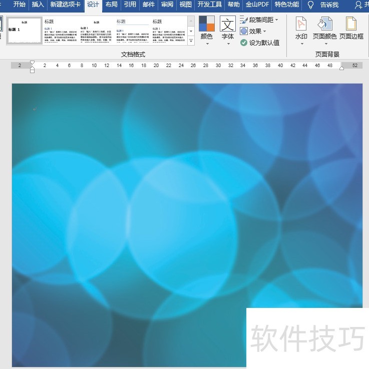 此外,图片位于文档背景中,可点击设计选项卡下页面颜色的填充效果进行设置。