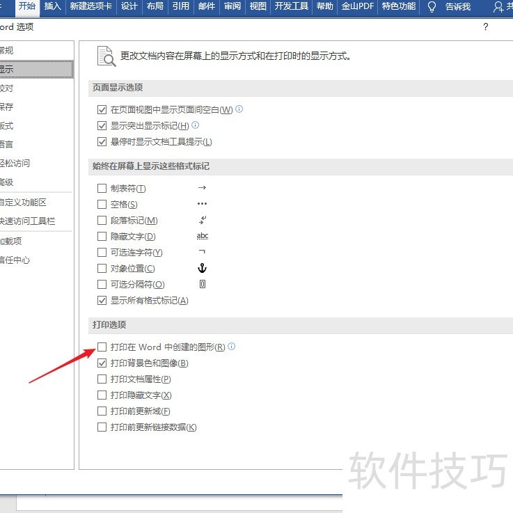 原因在于Word选项的显示设置中,打印在Word中创建的图形未被选中,导致相关内容无法正常打印。