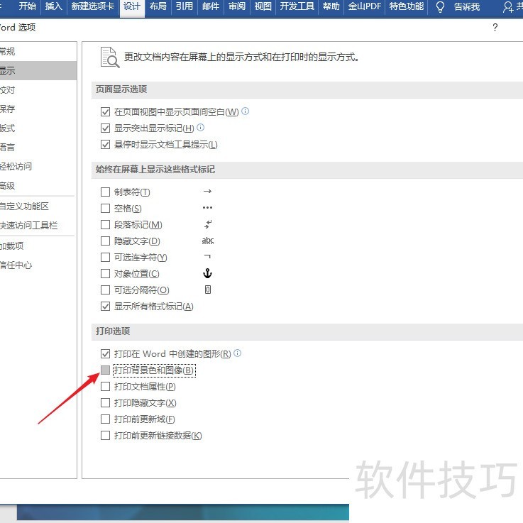 同样,在Word选项的显示选项卡中,打印背景色和图像未勾选。