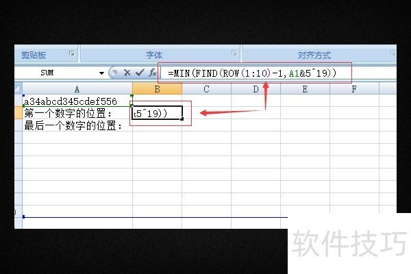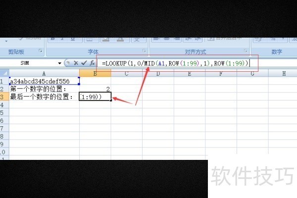在表格的A1单元格中输入一个包含数字的随机字符串,A2单元格输入第一个数字的位置:,A3单元格输入最后一个数字的位置:。