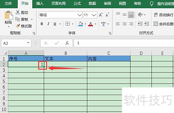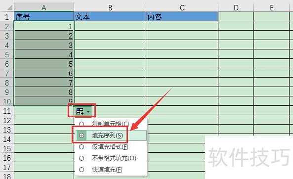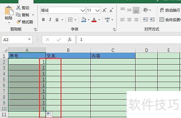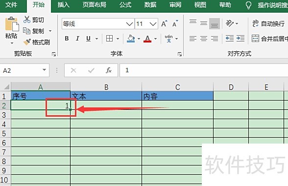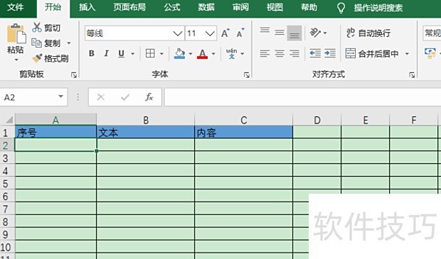 打开Excel,通常首行为标题行,例如:序号、文本、内容。