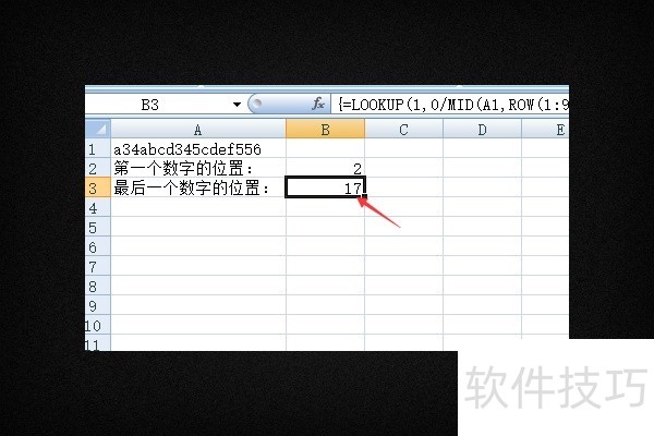 6、按住CTRL+Shift+Enter组合键,可在B3单元格返回字符串中最后一个数字的位置。