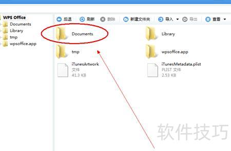 第六步:点击进入documents文件夹,WPS Office中查看的文件均存放在该目录下,因此需将导入的文件也保存在此文件夹中方可正常查看。所示。