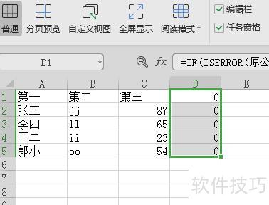 选中表格后,在编辑栏输入公式:=if(iserror(原公式),0,原公式)即可。