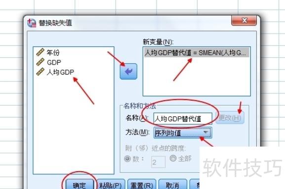打开后会弹出替换缺失值窗口,先选择需处理的变量并移至右侧空白框,设置变量名称,点击更改,然后选取序列均值作为替换方法,最后确认即可完成操作。