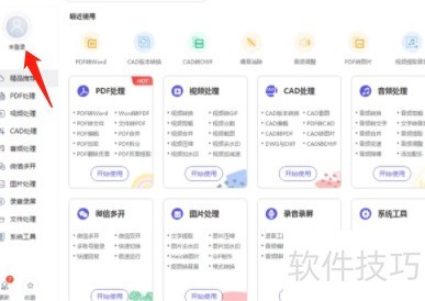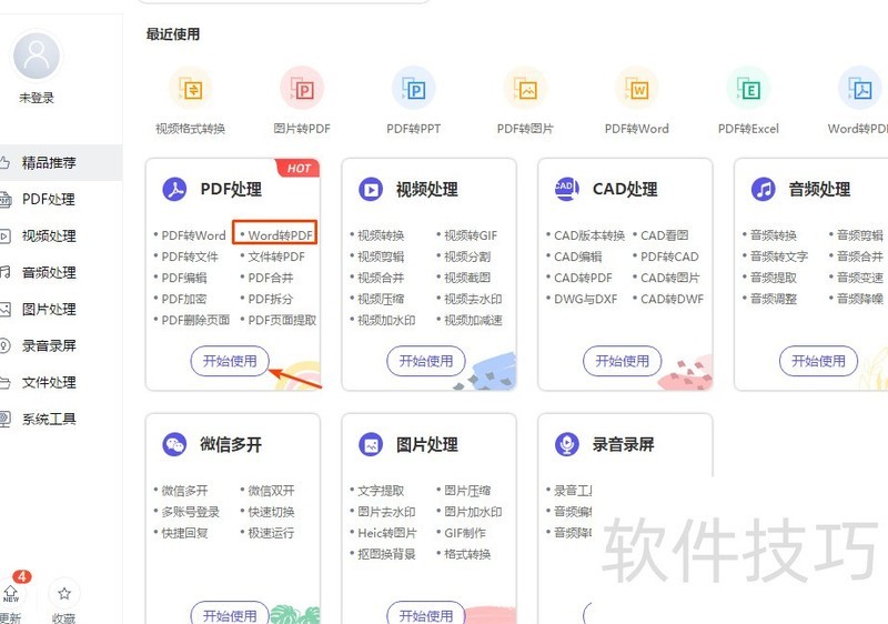 打开应用后,左侧有多个功能选项,选择PDF解决方案,再点击右侧的Word转PDF。此时会弹出网页页面,我们需上传相应的Word文档。后续操作流程与前述步骤一致。文件上传并保存后,点击登录,即可完成全部转换设置。