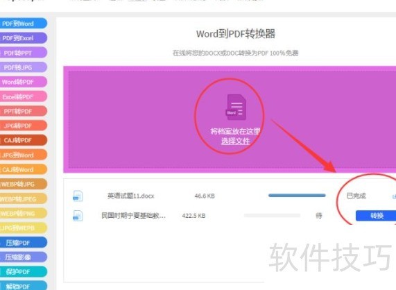根据网页提示上传需转换的Word文档,支持批量提交。上传后,下方目录将按顺序列出所有文件,点击文档旁的更改即可开始转换,通常一分钟内完成。转换成功后,点击免费下载即可获取生成的PDF文件。