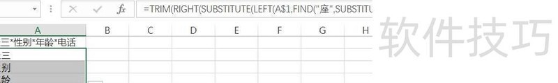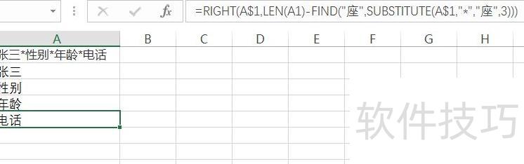 从A1单元格内容中,将第N个*替换为座,然后提取该位置前的所有字符,再以*分割,取右侧部分并去除多余空格,最终得到指定位置后的文本内容。公式通过组合LEFT、SUBSTITUTE、FIND等函数实现精准截取。