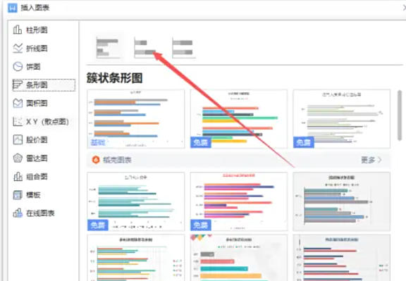 点击菜单栏 「插入」 → 选择 「图表」(图标为柱状图样式)。在弹出的「插入图表」窗口中,左侧选择 「条形图」,右侧预览区会显示默认样式(如簇状条形图、堆积条形图等)。