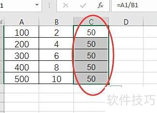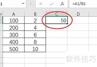 在C1单元格中输入公式:=A1/B1。