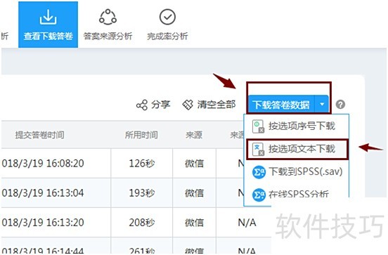 点击后进入下载答卷页面,点击右上角下载答卷数据按钮,在弹出窗口中选择按文本选项下载。