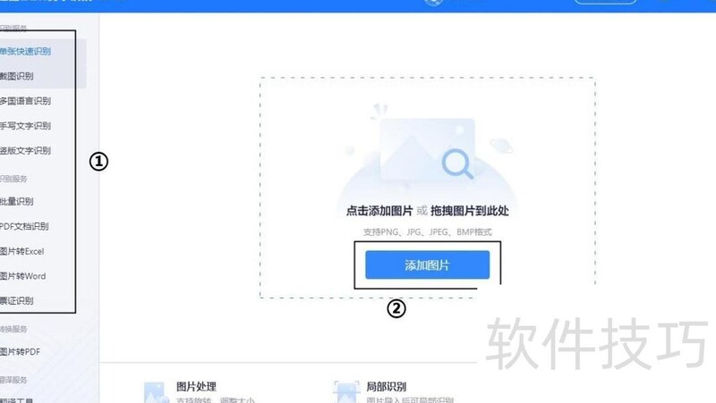 首先打开工具,左侧提供多种识别功能,如单张或多张图片识别、外文识别、手写体识别及竖排文字识别等。选择所需功能后,在右侧点击添加图片按钮,将待识别的图片导入系统即可开始处理,操作简便,识别准确高效,支持多种场景应用。