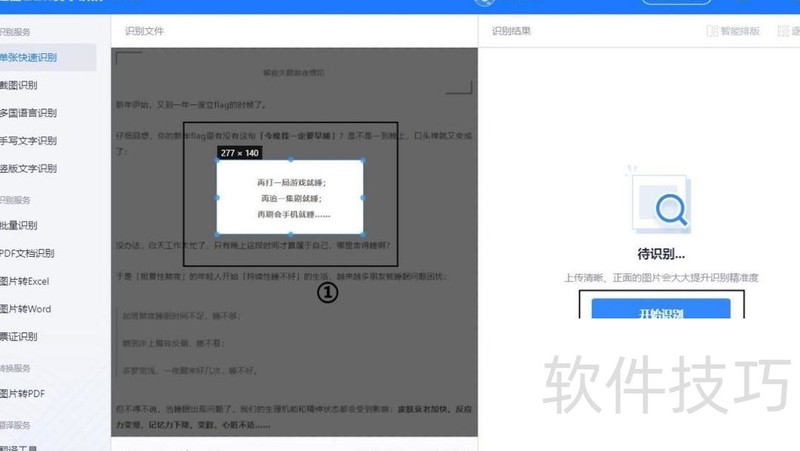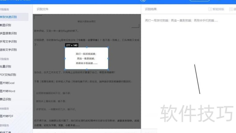 完成区域选择并点击识别后,内容将显示在右侧的结果框中,可根据需要选择翻译、复制或将内容以文档形式导出。