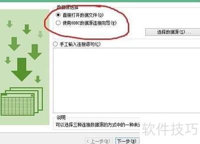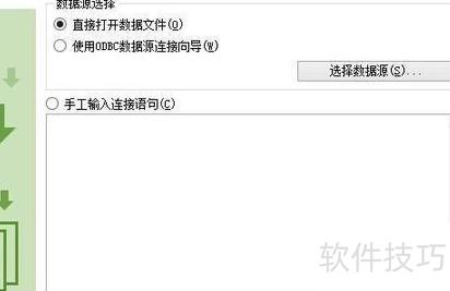 数据导入支持三种方式:直接打开文件、通过ODBC数据源向导连接,或手动输入连接语句。