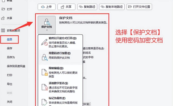 进入文件菜单,选择信息,点击保护文档下拉选项中的用密码加密。弹出加密文档窗口后,输入所需密码,确认并再次输入密码完成设置。