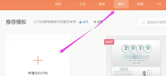 点击左上角 【新建】 → 选择 【演示】 → 点击 【新建空白文档】(创建PPT文件)。