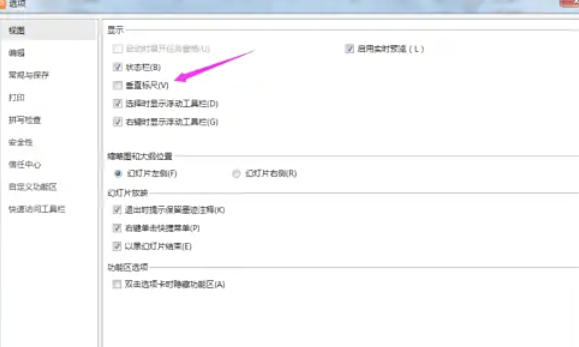 在弹出的 【选项】 窗口中,切换到 【视图】 选项卡(左侧菜单栏)。在 「显示」 区域中,找到 【垂直标尺】 选项。