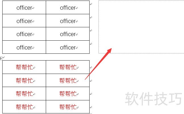 接下来介绍表格左右拆分的方法(Office无内置此功能)。很多人习惯用橡皮擦擦除边框实现拆分,其实有更高效的方式:在原表格下方保留两个段落标记,选中右侧需拆分部分,按CTRL+X剪切即可。