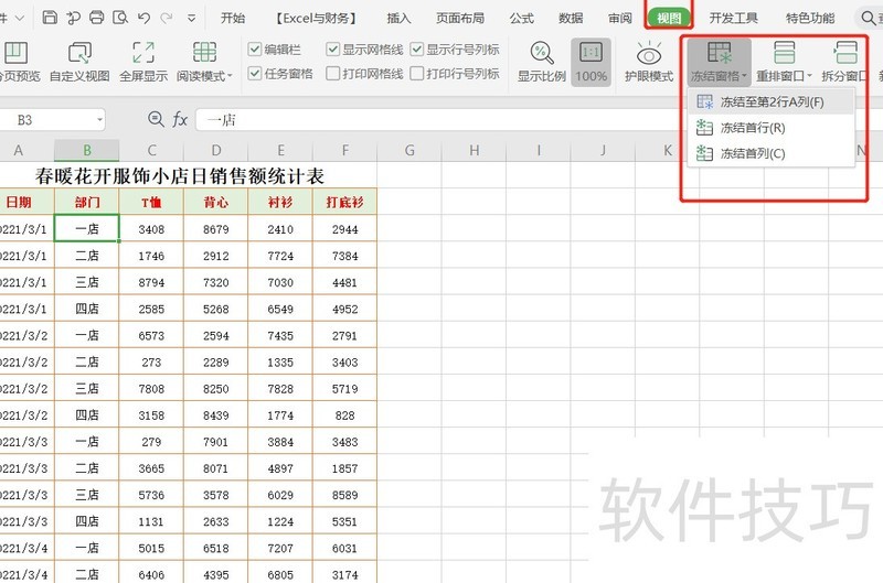 在选项卡中,点击按钮,可选择冻结当前单元格的行与列、首行或首列,方便查看表格内容。
