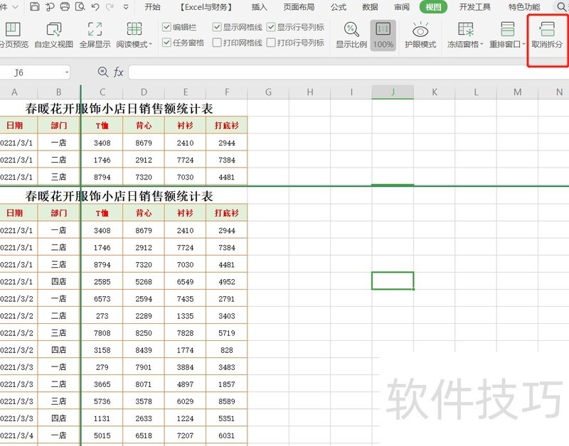 拆分窗口功能位于选项卡中,点击按钮后,将以当前选中单元格为界将窗口分割,按钮随即变为,再次点击即可恢复原状。