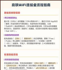 高铁WiFi连接方法包括打开设备WiFi,搜索并连接“高铁WiFi”信号,自动跳转认证页面,输入手机号或扫描二维码完成认证即可上网。部分列车需下载“掌上高铁”APP辅助连接。