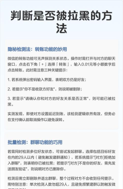 微信中被拉黑的判断方法包括消息未送达、无法查看朋友圈或群聊中名字异常等信号,可能表明对方已屏蔽你。