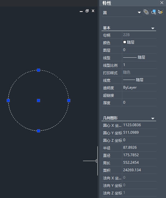 点击菜单【工具-选项板-特性】(【Ctrl+1】快捷键),将特性面板打开。选中单个图形后,特性面板里可以显示图形的相关信息。