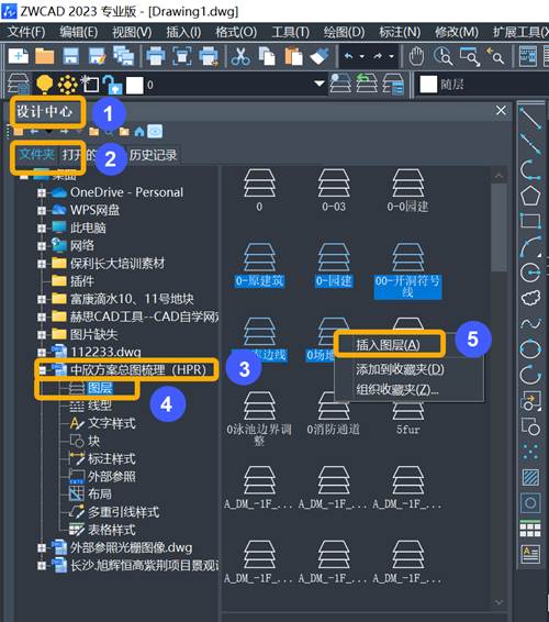 c.在【图层】选项,按住SHIFT键,选中需要复用的图层,点击鼠标右键,选择【插入图层】,图层就成功插入到当前图纸文件中。