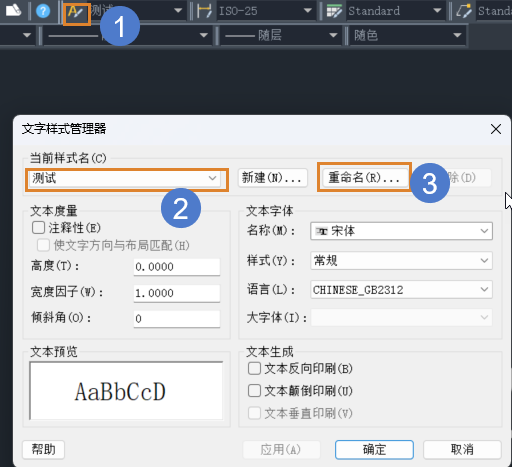 2.点击菜单【格式-文字样式】,调出文字样式管理器,选择步骤1中查看到的文字样式,点击【重命名】,将名称改为其他名称,这样复制图形过去就不会有样式变化的问题。