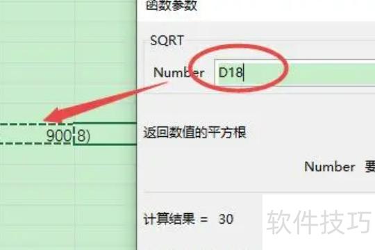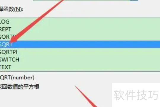 点击SQRT函数后确认,该函数用于计算数值的平方根。也可直接在单元格中输入:=SQRT(A1)。