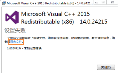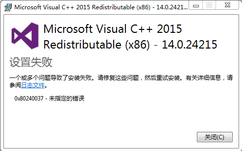 在启动CAD提示:"无法启动此程序,因为计算机丢失mfc140u.dll"。此时需要安装VC++2015,但安装过程失败,出现以下提示: