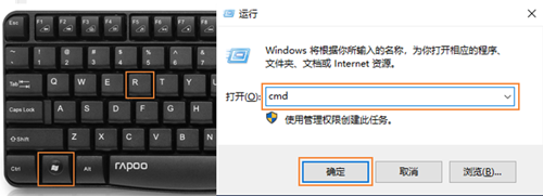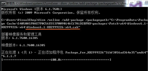 4.打开【运行】(可通过键盘的【win+r】键来调出该窗口),输入【cmd】打开命令行窗口。在命令行输入:dism /online /add-package /packagepath:"C:UsersAdministratorDesktopWindows6.1-KB2999226-x64Windows6.1-KB4019990-x64.cab"(红色部分为复制的路径), 按【Enter】键,开始安装该文件。等待程序包进度到100%即安装成功。