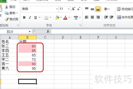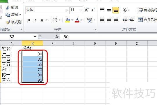 打开Excel,以图示为例,需将B列分数在80至90分之间的单元格用浅红色填充并设置深红色字体,首先选中B2至B7区域。