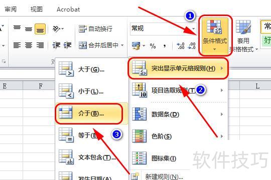 点击条件格式,选择突出显示单元格规则中的介于选项。