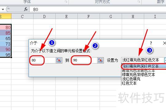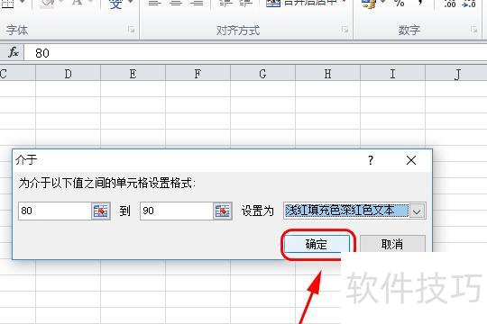 在弹出窗口中输入80和90,选择浅红填充色深红色文本作为设置,所示。