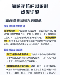 手机呼叫限制可通过设置或运营商解除。用户可进入手机设置,找到通话设定中的呼叫限制选项,输入密码禁用限制。若无法操作,可联系运营商或使用专业服务如【号清清】申诉。