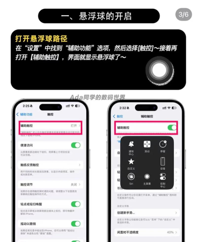 苹果悬浮球即辅助触控功能,打开方法:进入“设置”>“辅助功能”>“触控”>“辅助触控”,开启开关即可。可自定义菜单和手势操作。