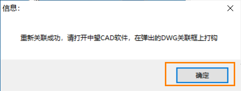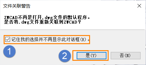 4. 关闭中望CAD,重新启动,软件弹出”文件关联警告“,勾上【记住选择】,并点击【是】,重新建立文件关联。