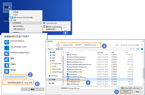 2.如打开方式不能直接找到,点击【选择其他应用-在这台电脑上查找其他应用】,在中望CAD安装目录下找到【ZwLauncher.exe】打开,勾选【始终使用此应用打开.dwg文件】即可。