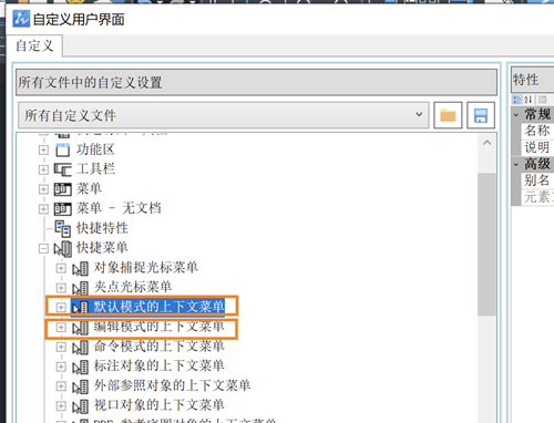 2.在【快捷菜单】修改【默认模式的上下文菜单】和【编辑模式的上下文菜单】;