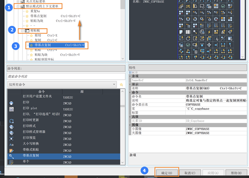 3.展开【默认模式的上下文菜单】,展开【剪切板】,找到【带基点复制】命令,拖拽到图示位置,设置完毕【确认】保存并退出。