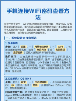 查看手机已连接WiFi密码的方法因系统而异:iOS用户可通过iCloud钥匙串在Mac上查看;Android用户需root权限并使用第三方软件,或通过路由器后台查看。建议定期修改密码并开启MAC过滤以保障安全。