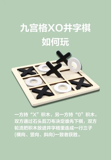 井字棋是一种在3*3格子上进行的连珠游戏,两名玩家轮流使用X和O标记,先在任意一条直线(横、竖、斜)上连成三个相同标记者获胜。游戏工具为纸和笔,简单易学。